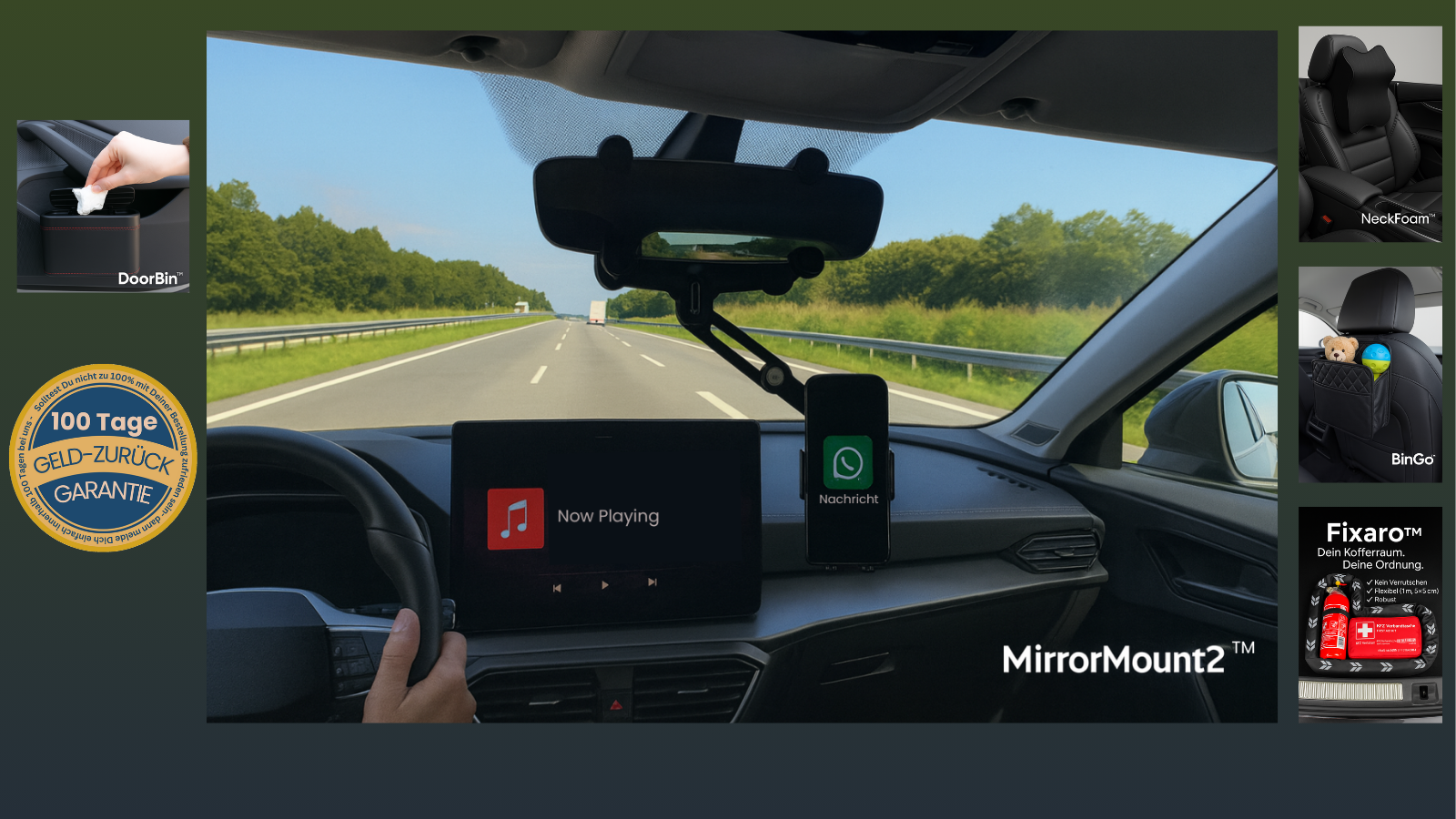 - ✅Werkzeugfreie Montage – in Sekunden am Rückspiegel befestigt