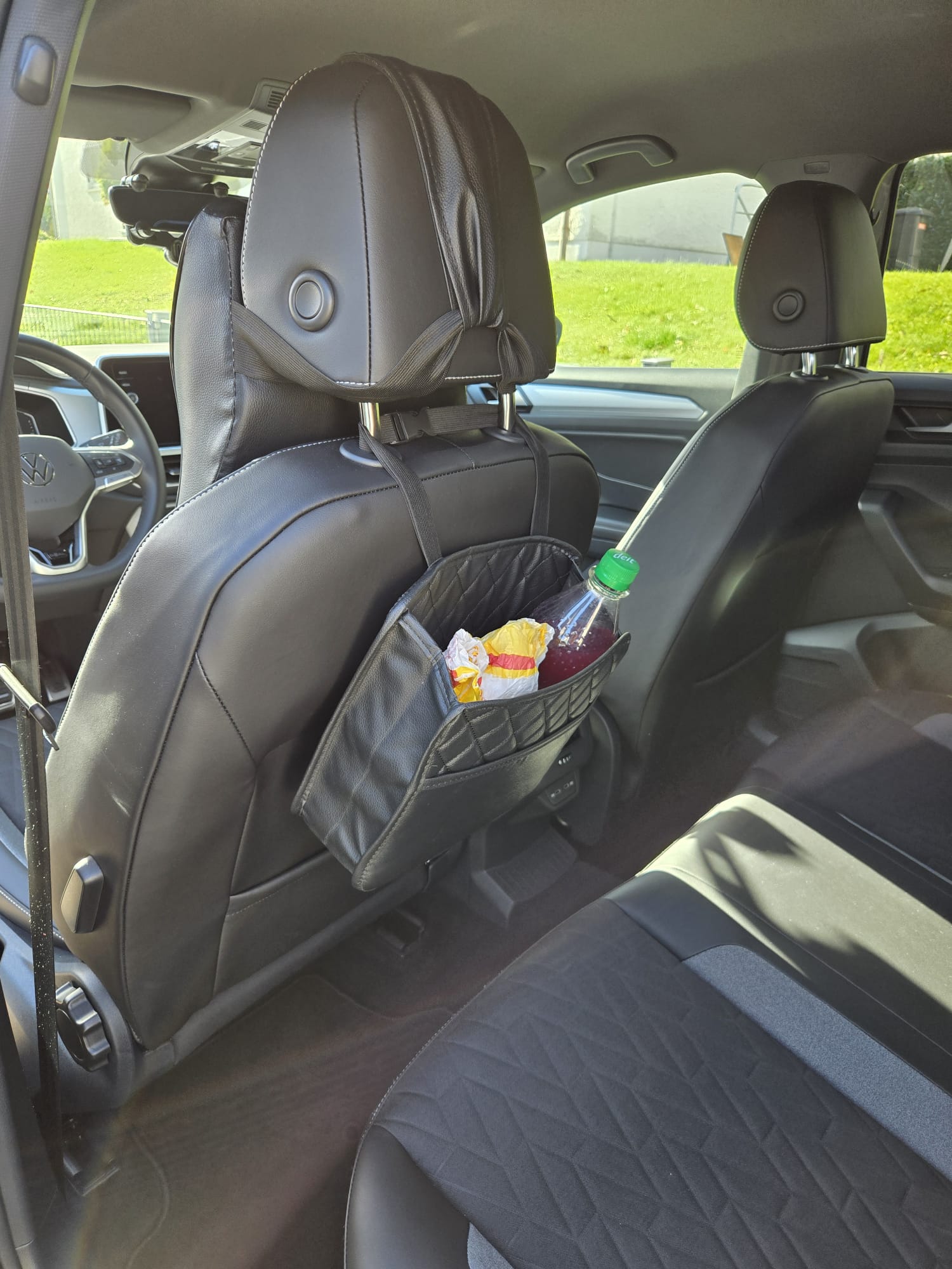 Ich habe ihn an der Kopfstütze befestigt und je nach Situation drehe ich ihn einfach nach vorne oder hinten. So können die Kids hinten alles selbst erreichen. Einfach genial!